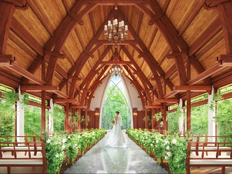 【木の温もりと陽光に包まれた独立型チャペル】◆木漏れ日や緑を感じられる空間で温かなセレモニーが叶う◆おふたりの出逢いや、背景をヒアリングしてふたりらしい挙式をご提案(100名収容)